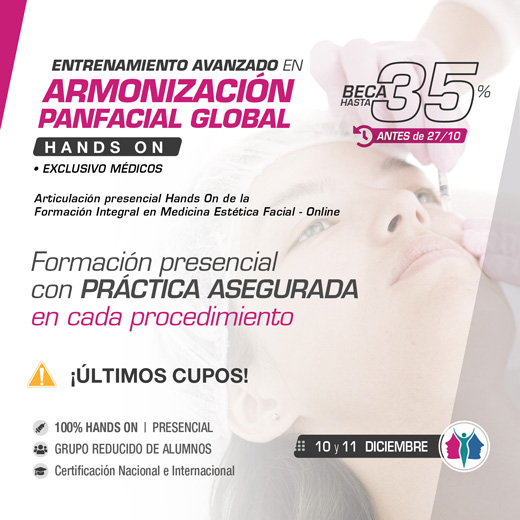 Sede: Modalidad: presencial, 100% hands on, grupo reducido de alumnos. Articulación presencial Hands On de la Especialización en Medicina Estética Facial (online). Dirigido a: exclusivo médicos. Certificación: nacional e internacional. Vacantes: limitadas Ultimos cupos. Becas: 35% hasta el 27/10. Más info