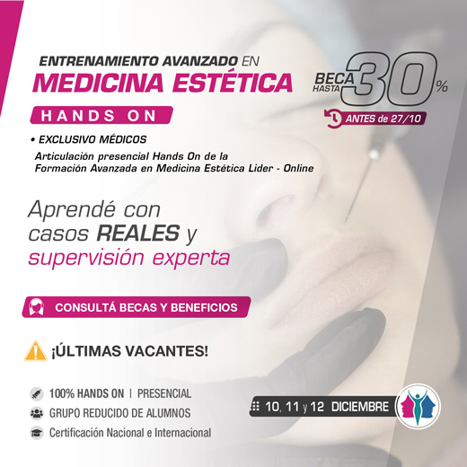 Sede: SAENI Buenos Aires: Av. Rivadavia 4447, piso 1, CABA. Modalidad: Presencial, 100% hands on, grupo reducido de alumnos. Dirigido a: exclusivo médicos. Articulación presencial Hands On de la Formación Avanzada en Medicina Estética Líder (online). Certificación: nacional e internacional. Becas: 30% hasta el 27/10/25. Más info