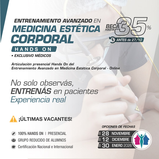 Sede: Modalidad: presencial, 100% hands on, grupo reducido de alumnos. Articulación presencial Hands On de la Especialización en Medicina Estética Facial (online). Dirigido a: exclusivo médicos. Certificación: nacional e internacional. Vacantes: limitadas Ultimos cupos. Opciones de fechas: 12/12 ó 30/1. Becas: 35% hasta el 27/10. Más info